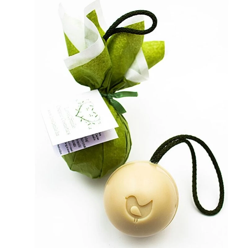 Bőrbarát, természetes alapanyagokból készült zuhanyszappan. A szappan gömb formája megkönnyíti a zuhanyozás közbeni kézben tartást, miközben a szappan közepébe helyezett akasztó révén, könnyen tárolható. Két zuhanyozás közben a szappan így felázás nélkül tud megszáradni és hosszan megőrzi állagát.